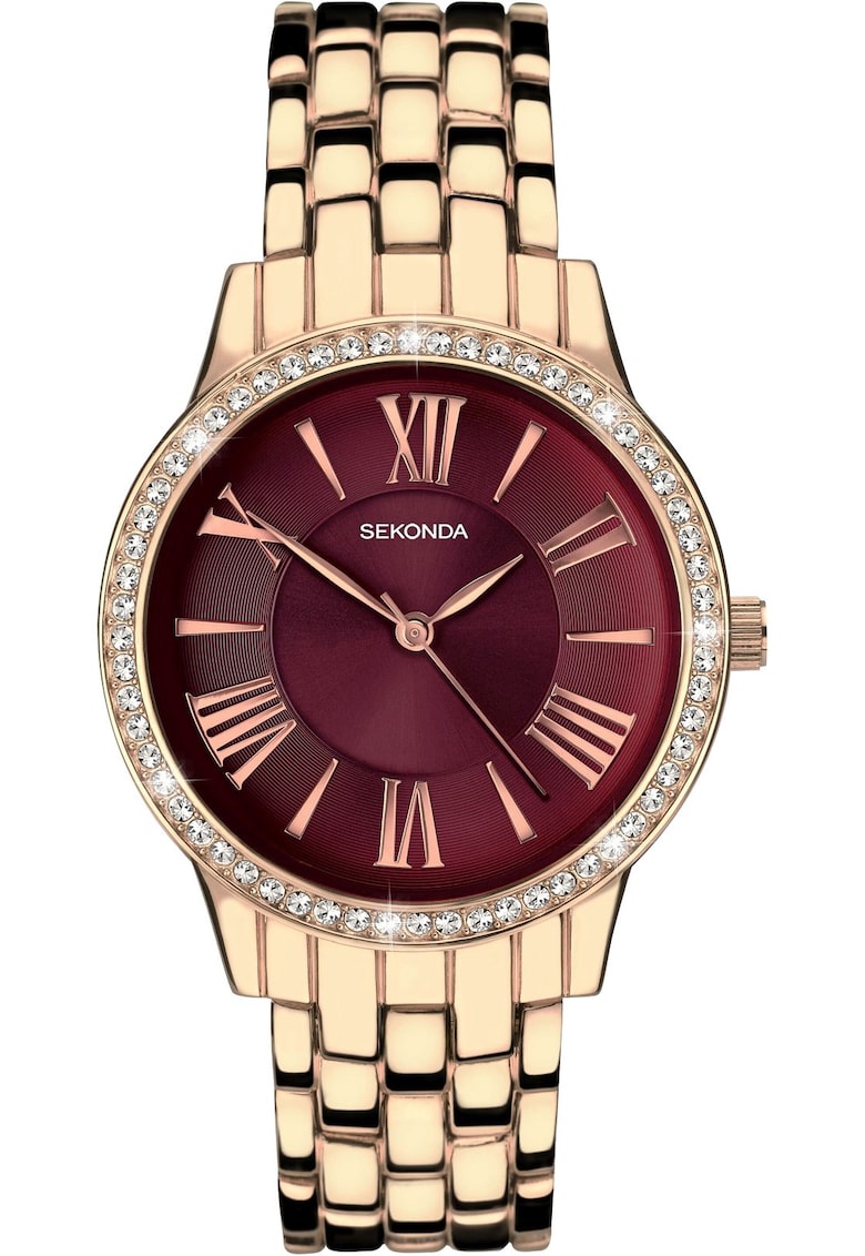 Caracteristici Tip mecanism: quartz Tip display: analog Stil: elegant Rezistenta la apa: 3 atm Ambalaj: produsul este livrat cu un certificat de autenticitate. Cadran Material geam: cristal mineral Culoare cadran: rosu Carcasa Material carcasa: metal Culoare carcasa: aur roz Curea/bratara Tip: bratara Material curea/bratara: metal Culoare curea/bratara: aur roz
