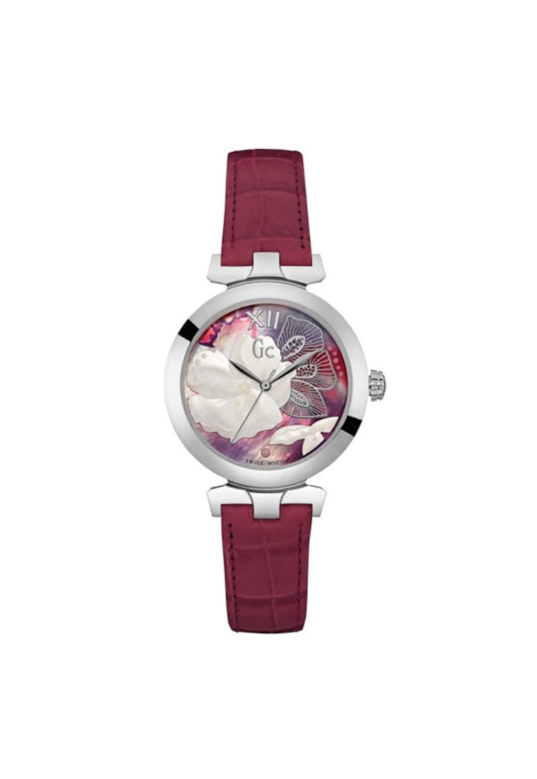 Caracteristici Tip mecanism: quartz Tip display: analog Stil: elegant Functii: ora Rezistenta la apa: 5 atm Cadran Material geam: cristal mineral Culoare cadran: multicolor Tip citire cadran: fara indici Carcasa Forma carcasa: rotunda Material carcasa: inox Culoare carcasa: argintiu Diametru carcasa: 34 mm Curea/bratara Tip: curea Material curea/bratara: piele naturala Culoare curea/bratara: violet