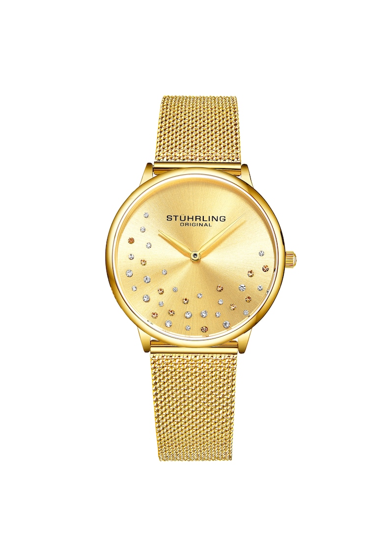 - minut Rezistenta la apa: 3 atm Detalii: cristale pe cadran Cadran Material geam: cristal mineral Culoare cadran: auriu Carcasa Forma carcasa: rotunda Material carcasa: inox Culoare carcasa: auriu Diametru carcasa: 35 mm Grosime carcasa: 8 mm Curea/bratara Tip: plasa Material curea/bratara: inox Culoare curea/bratara: auriu Latime curea/bratara: 18 mm