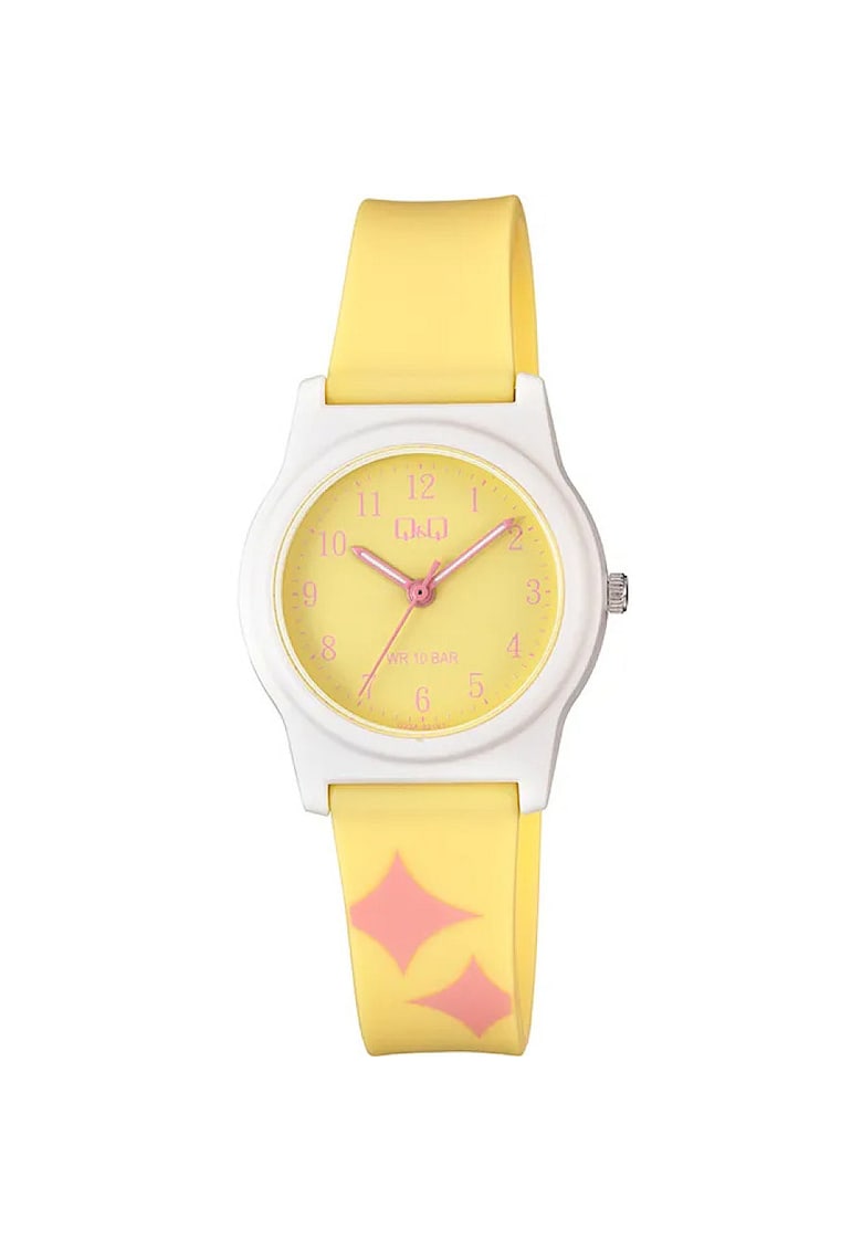 - minut Finisaj carcasa: mat Tip citire cadran: cifre arabe Culoare curea/bratara: galben Sistem inchidere: catarama Compozitie Material carcasa: plastic Material curea/bratara: cauciuc Material geam: plastic Finisaj curea/bratara: mat Dimensiuni Diametru carcasa: 30 mm Latime curea/bratara: 16 mm
