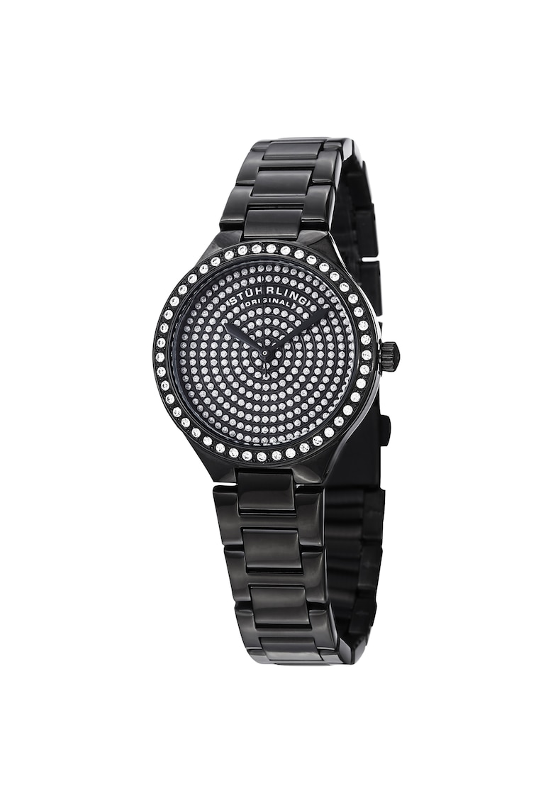 - secunda Rezistenta la apa: 5 atm Detalii: decorat cu cristale Cadran Material geam: cristal mineral Culoare cadran: negru Carcasa Forma carcasa: rotunda Material carcasa: inox Culoare carcasa: negru Diametru carcasa: 32 mm Curea/bratara Tip: bratara Material curea/bratara: inox Culoare curea/bratara: negru