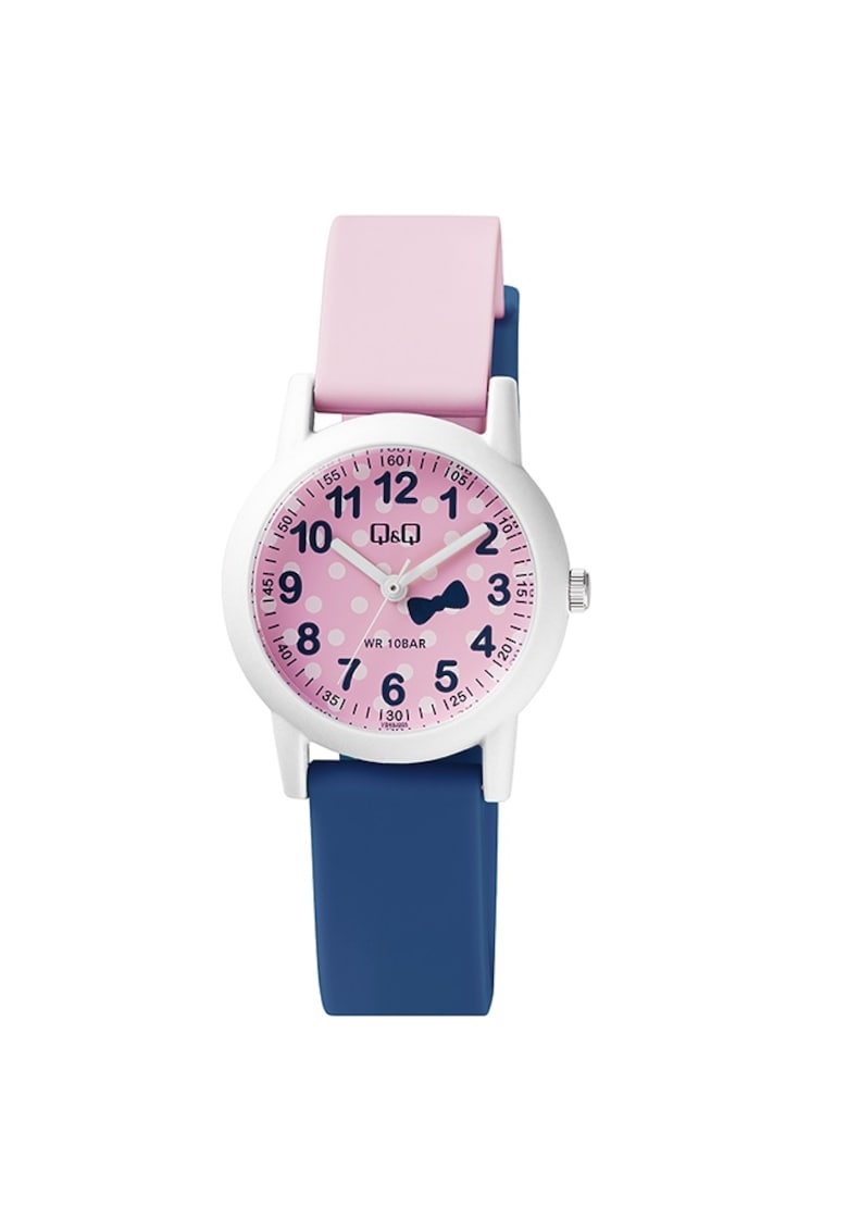 Caracteristici Mecanism: quartz Rezistenta la apa: 10 atm Stil: casual Afisaj: analog Carcasa: rotunda Culoare carcasa: alba Functii: analog Finisaj carcasa: mat Tip citire cadran: cifre arabe Culoare curea/bratara: roz/bleumarin Sistem inchidere: catarama Compozitie Material carcasa: plastic Material curea/bratara: cauciuc Material geam: acrilic Dimensiuni Diametru carcasa: 32 mm Latime curea/bratara: 16 mm