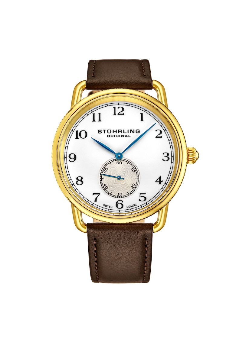 - secunda Rezistenta la apa: 5 atm Cadran Material geam: cristal mineral Tip citire cadran: cifre romane Carcasa Forma carcasa: rotunda Material carcasa: inox Culoare carcasa: auriu Diametru carcasa: 41 mm Curea/bratara Tip: curea Material curea/bratara: piele naturala Culoare curea/bratara: maro