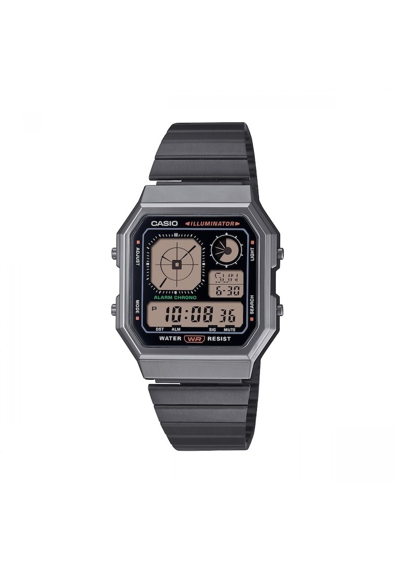 Caracteristici generale Tip mecanism: quartz Stil: casual Tip display: digital Functii: afisare data Rezistenta la apa: 3 atm Cadran Material geam: cristal mineral Culoare cadran: negru Tip citire cadran: cifre arabe Carcasa Forma carcasa: dreptunghiulara Material carcasa: rasina Culoare carcasa: gri Diametru carcasa: 34 mm Curea/bratara Tip: bratara Material curea/bratara: aluminiu Culoare curea/bratara: argintiu