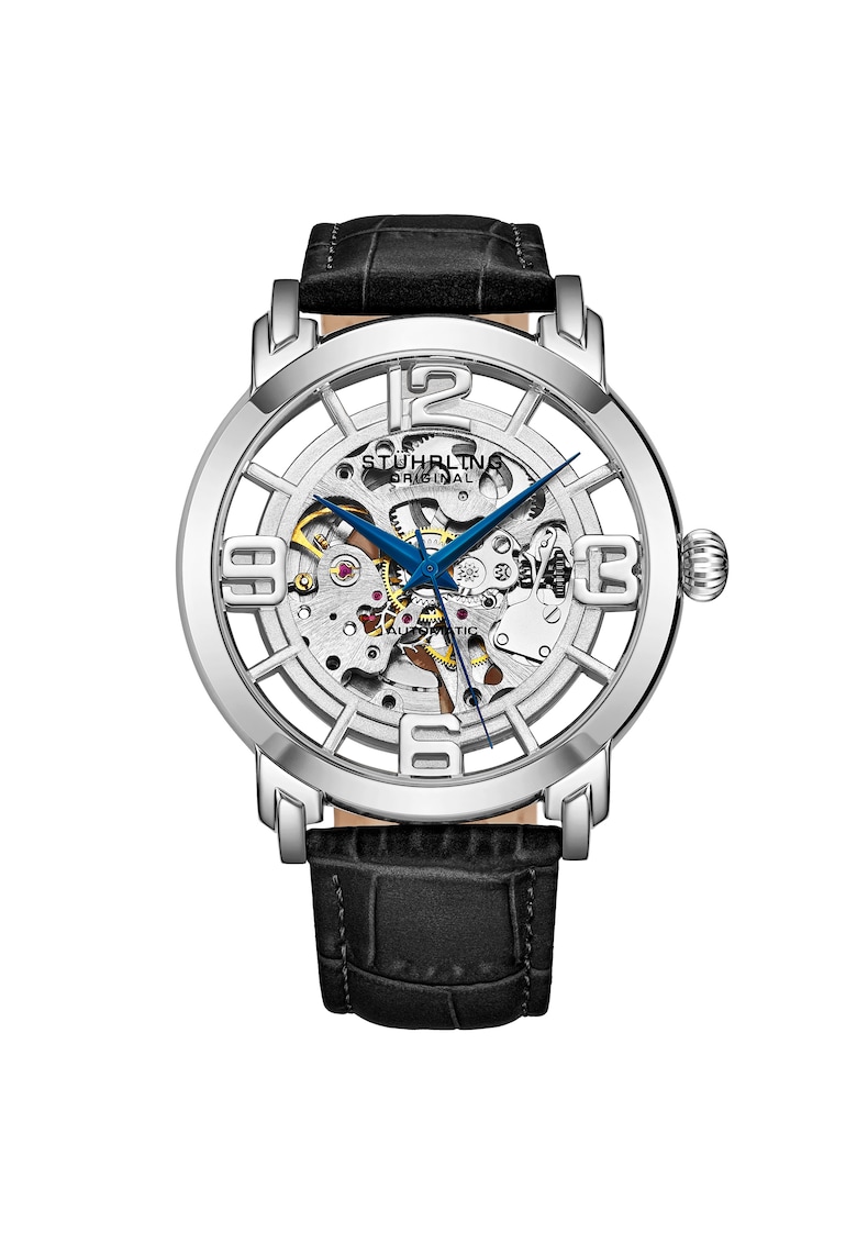 - secunda Rezistenta la apa: 5 atm Detalii: cadran skeleton Cadran Material geam: cristal mineral Tip citire cadran: cifre arabe Carcasa Forma carcasa: rotunda Material carcasa: aliaj Culoare carcasa: argintiu Diametru carcasa: 42 mm Curea/bratara Tip: curea Material curea/bratara: piele naturala Culoare curea/bratara: negru