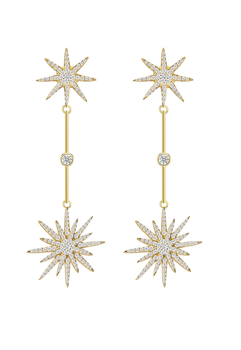 Caracteristici Tip produs: cercei Material: cupru Culoare: auriu Ambalaj: produsul este livrat in ambalaj personalizat. Compozitie Compozitie: cupru Pietre: zirconiu Placaj: aur galben de 18k Dimensiuni Lungime: 5 cm Informatii suplimentare: a se evita lovirea