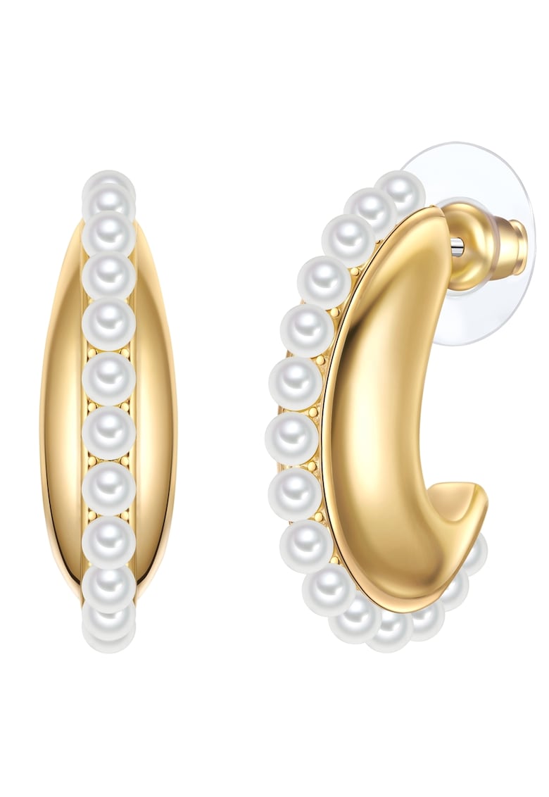 Caracteristici Tip produs: cercei Material: metal Culoare: auriu Detalii: model semicerc Sistem inchidere: tija si surub Ambalaj: produsul se livreaza in ambalaj personalizat. Compozitie Compozitie: metal Pietre: perle sintetice Placaj: aur 14k Dimensiuni Lungime: 2.7 cm Informatii suplimentare: a se evita socurile mecanice si termice