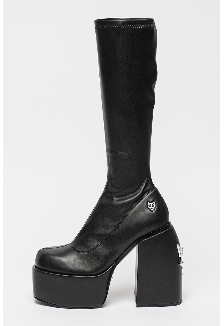 Caracteristici Tip: cu toc Culoare: negru Material: piele ecologica Imprimeu: uni Stil: casual Varf: rotund Tip toc: masiv Inaltime: 34 cm Culoare elemente metalice: argintiu Sistem inchidere: fara inchidere Compozitie Partea superioara: alte materiale Material interior: textil Material talpa: alte materiale Dimensiuni Inaltime toc: 13 cm Platforma fata: 5.5 cm