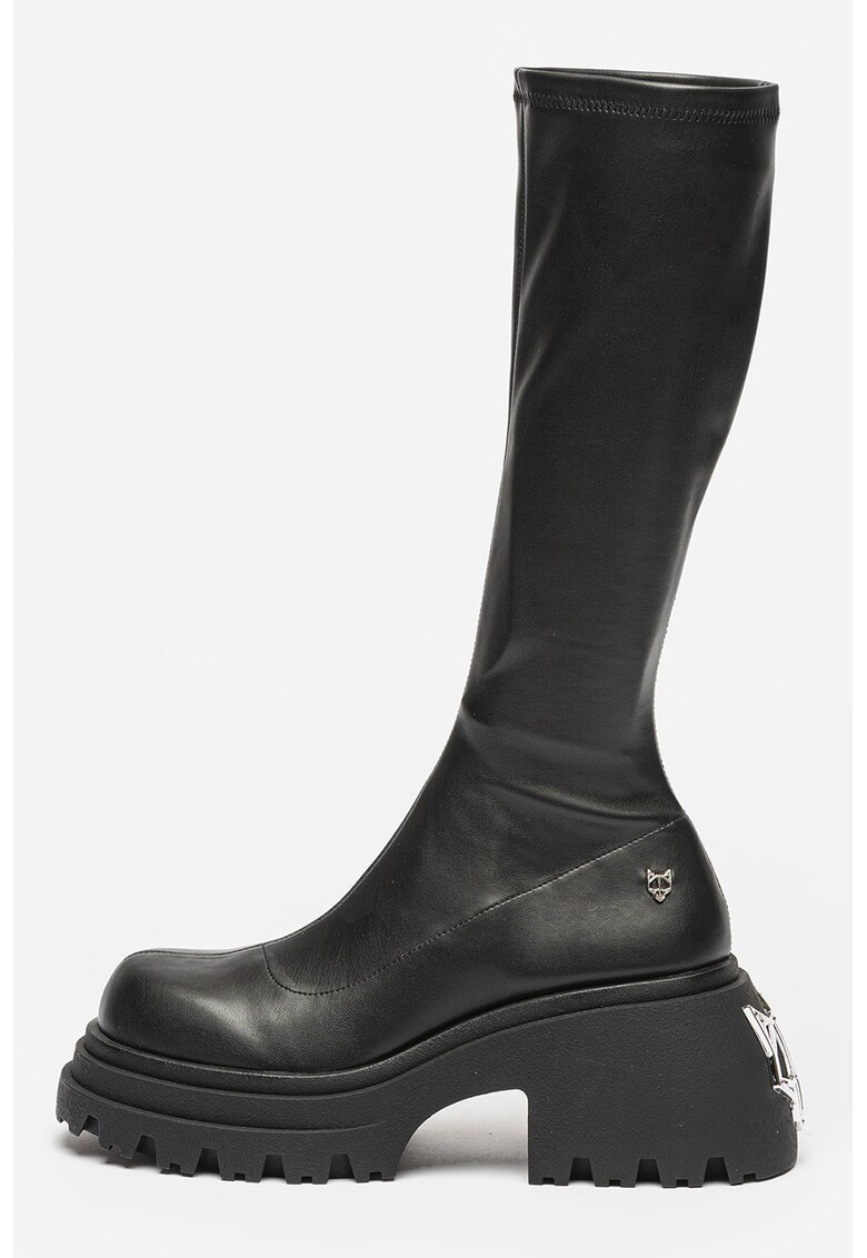 Caracteristici Tip: cu toc Culoare: negru Material: piele ecologica Imprimeu: uni Stil: casual Varf: rotund Tip toc: masiv Inaltime: 33 cm Culoare elemente metalice: negru Sistem inchidere: fara inchidere Compozitie Partea superioara: alte materiale Material interior: textil Material talpa: alte materiale Dimensiuni Inaltime toc: 7 cm