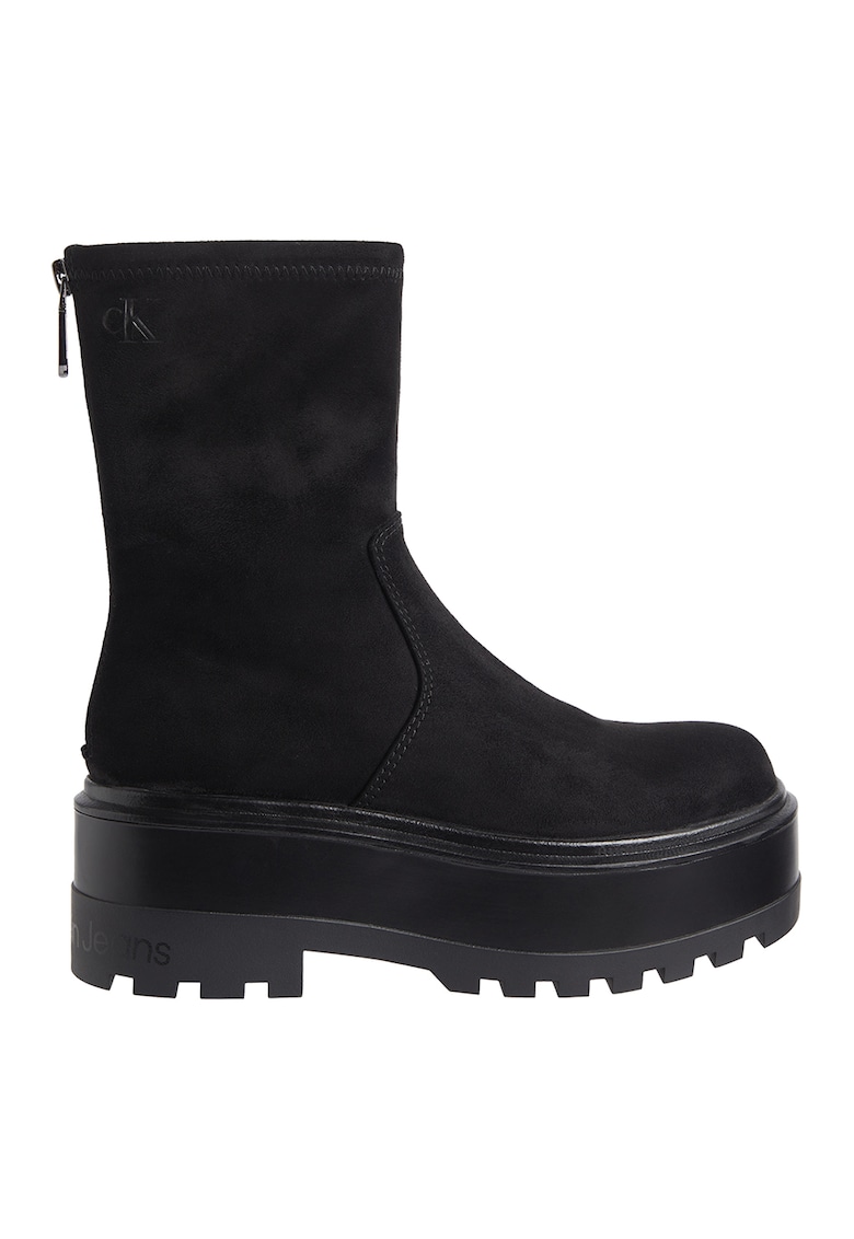 Caracteristici Tip: cu platforma Culoare: negru Material: piele intoarsa Imprimeu: logo Stil: casual Varf: rotund Tip talpa: demi-wedge Detalii: contine material reciclate Culoare elemente metalice: argintiu Sistem inchidere: fermoar Compozitie Partea superioara: piele intoarsa Material interior: textil Material talpa: alte materiale Dimensiuni Platforma spate: 6 cm