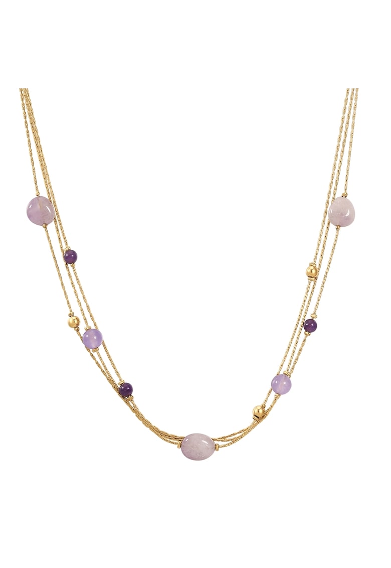 Caracteristici Tip produs: colier Material: inox Culoare: auriu Sistem inchidere: lobster Ambalaj: produsul este livrat in ambalaj personalizat . Compozitie Compozitie: inox Pietre: ametist Placaj: aur galben de 14k Dimensiuni Lungime: 40 + 5 cm Informatii suplimentare: a se evita contactul cu alcool
