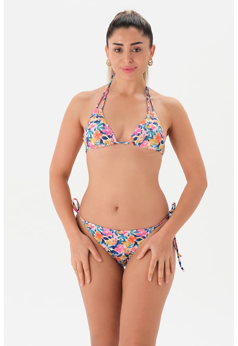Detalii generale Tip produs: costum doua piese Culoare: multicolor Imprimeu: floral Forma cupa: triunghi Material: sintetic Barete: prindere pe partea din spate Sistem inchidere: snur Design Tip sutien: fara burete Sustinere metalica: fara sarma Stil decolteu: v Tip slipi: brazilian Compozitie Exterior: 80% poliester