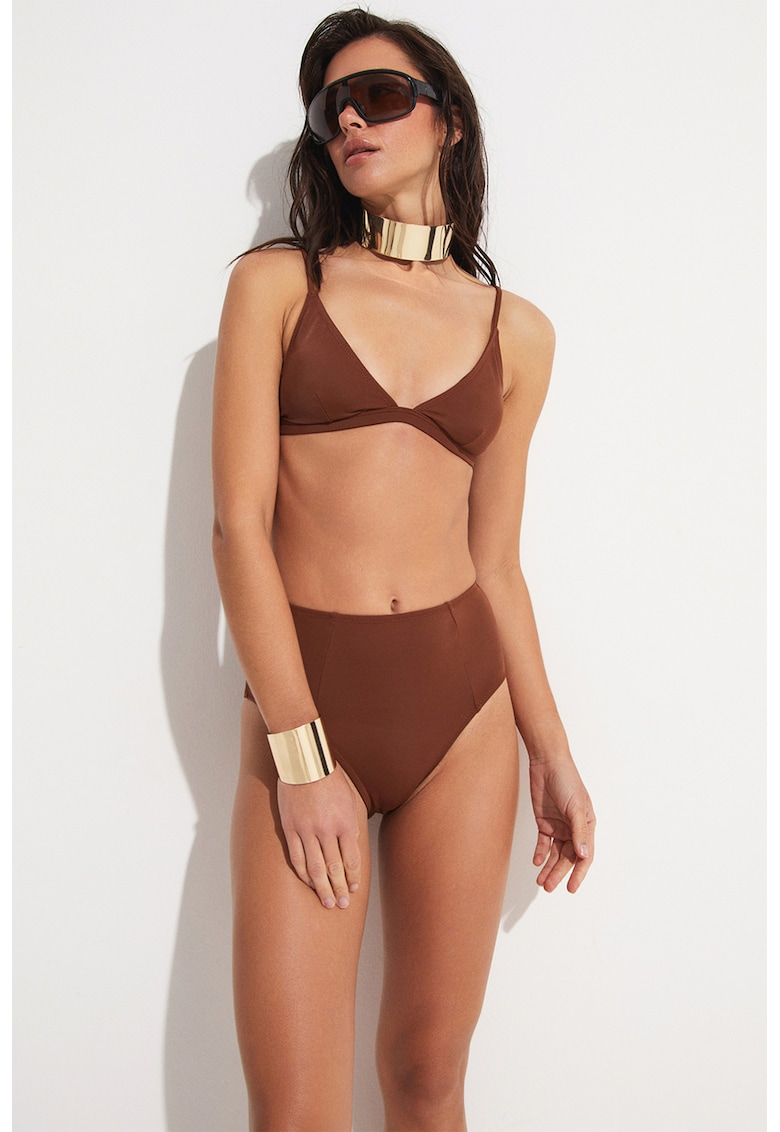 Detalii generale Tip produs: costum doua piese Culoare: maro Imprimeu: uni Forma cupa: triunghi Material: sintetic Barete: ajustabile Detalii: talie inalta Sistem inchidere: clema Design Tip sutien: fara burete Sustinere metalica: fara sarma Tip slipi: clasic Compozitie Exterior: 80% poliamida