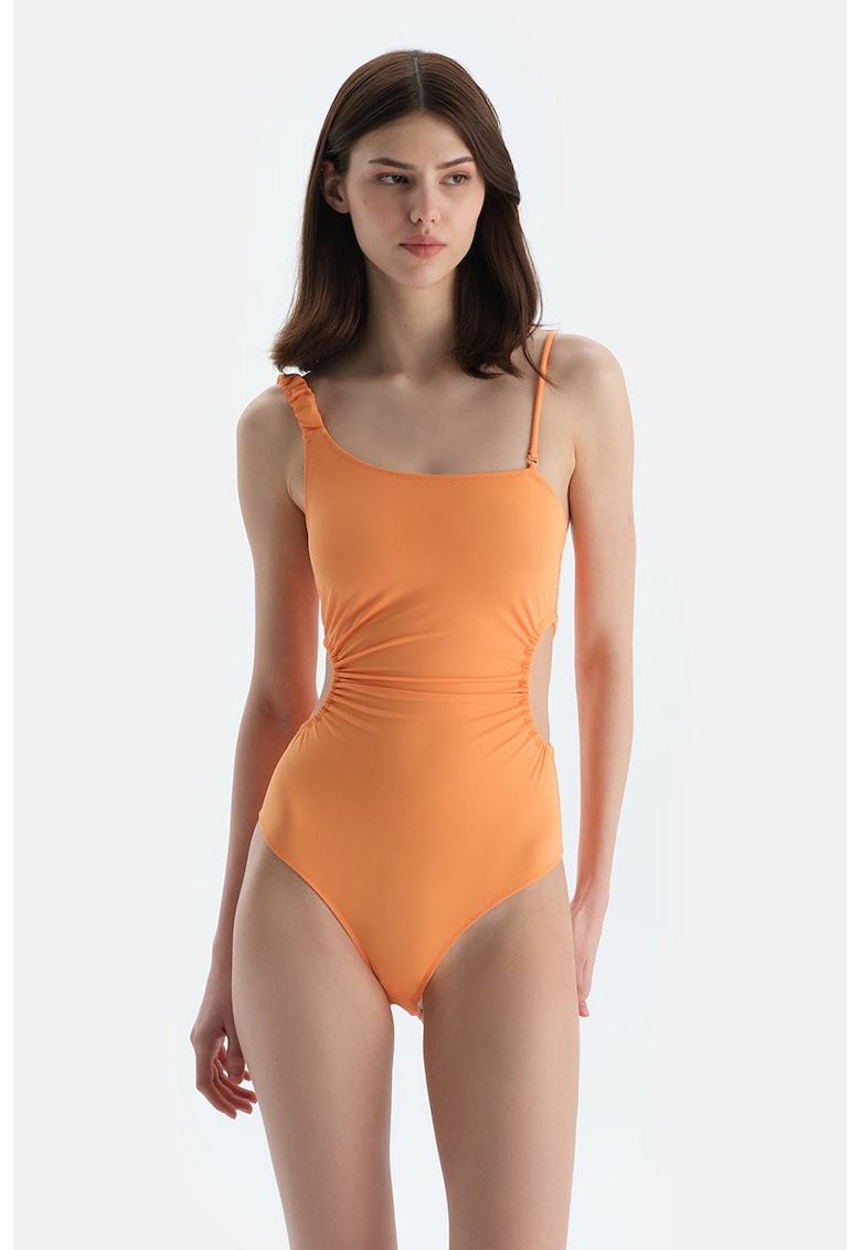 Detalii generale Tip produs: costum intreg Culoare: portocaliu Imprimeu: uni Forma cupa: plina Material: sintetic Sistem inchidere: fara inchidere Design Tip sutien: cu burete Sustinere metalica: fara sarma Stil decolteu: asimetric Tip slipi: brazilian Compozitie Exterior: 80% poliamida