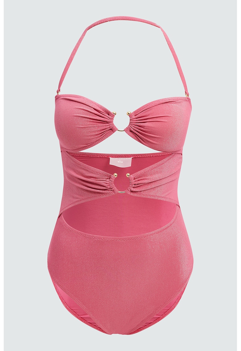 Detalii generale Tip produs: costum intreg Culoare: roz pastel Imprimeu: uni Forma cupa: balconette Material: poliamida Barete: halter Sistem inchidere: fara inchidere Design Tip sutien: cu burete Sustinere metalica: fara sarma Tip slipi: clasic Compozitie Exterior: 69% poliamida