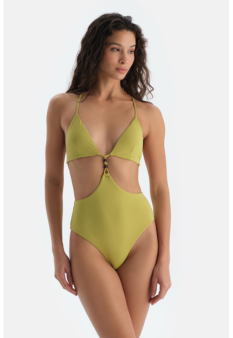 Detalii generale Tip produs: costum intreg Culoare: verde deschis Imprimeu: uni Forma cupa: plunge Material: sintetic Sistem inchidere: clema Design Tip sutien: cu burete Sustinere metalica: fara sarma Stil spate: y Tip slipi: brazilian Compozitie Exterior: 85% poliamida