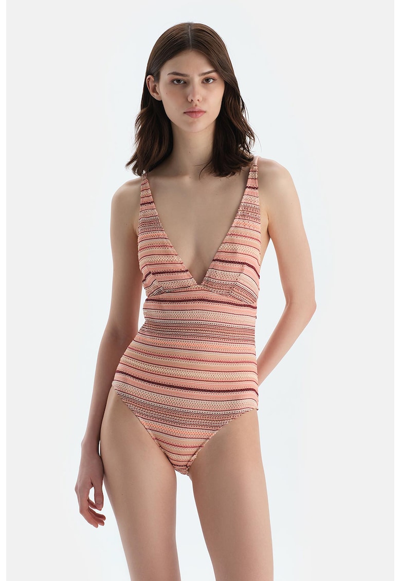 Detalii generale Tip produs: costum intreg Culoare: bej Imprimeu: dungi Forma cupa: plunge Material: sintetic Sistem inchidere: fara inchidere Design Tip sutien: cu burete Sustinere metalica: fara sarma Stil spate: x Tip slipi: clasic Compozitie Exterior: 80% poliamida