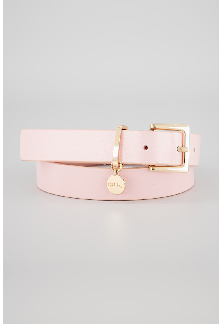 Caracteristici Culoare: roz pastel Material: piele naturala Imprimeu: uni Stil: subtire Catarama: cu nit Detalii: logo metalic Culoare elemente metalice: auriu Sistem inchidere: catarama Compozitie Exterior: 100% piele neprelucrata de vaca Dimensiuni Latime: 2.5 cm