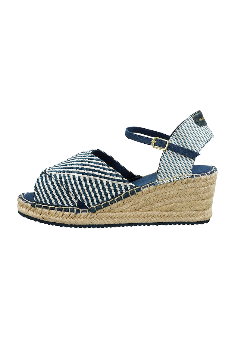 - bleumarin Material: textil Imprimeu: cu model Stil: casual Tip talpa: wedge Culoare elemente metalice: auriu Sistem inchidere: catarama Compozitie Partea superioara: textil Material interior: textil Material talpa: alte materiale Dimensiuni Platforma spate: 6 cm