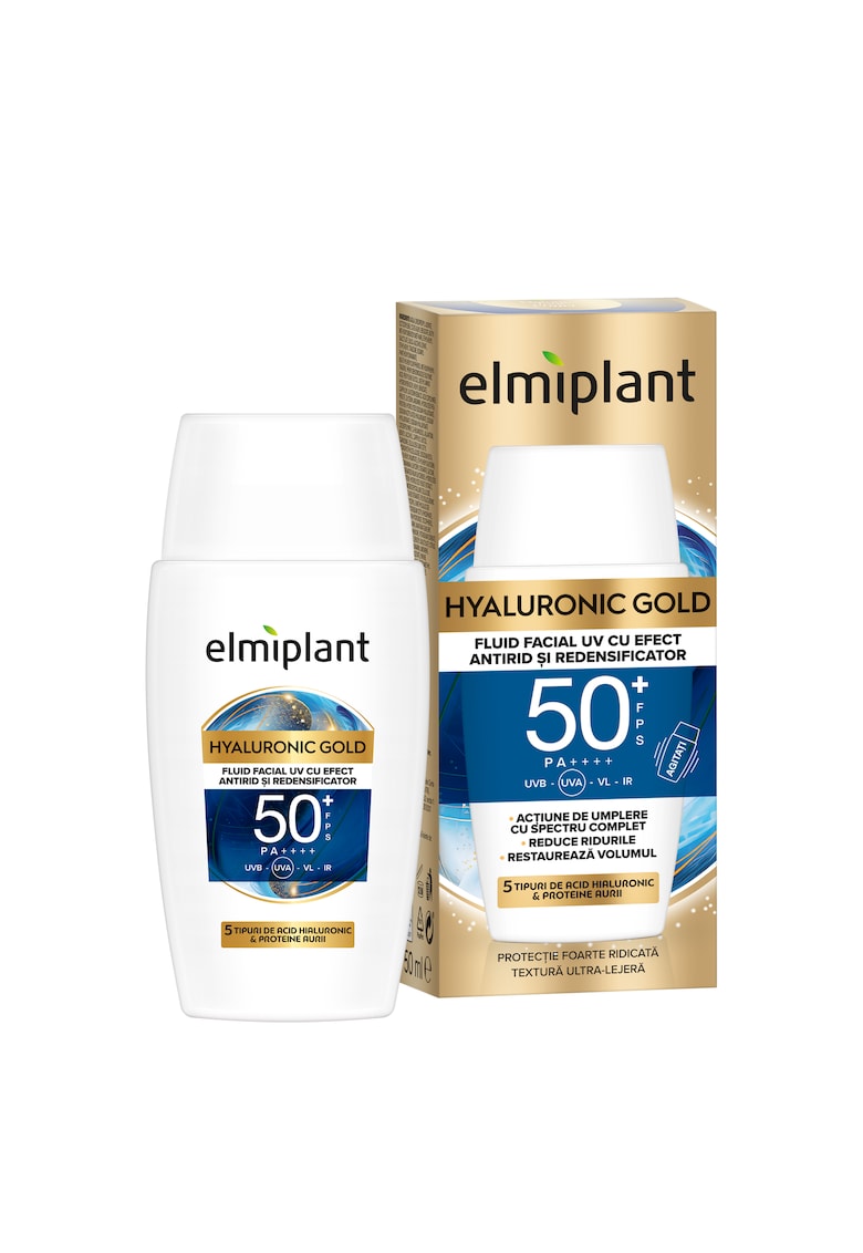 Caracteristici generale Tip produs: lotiune de fata Zona corporala: fata Set: nu Utilizare: zi Tip: clasic Ingredient principal: acid hialuronic Varsta: toate varstele Gama: hyaluronic gold Tipul de ten: normal Protectie solara: 50 spf Forma/Textura: fluid Beneficii: antirid