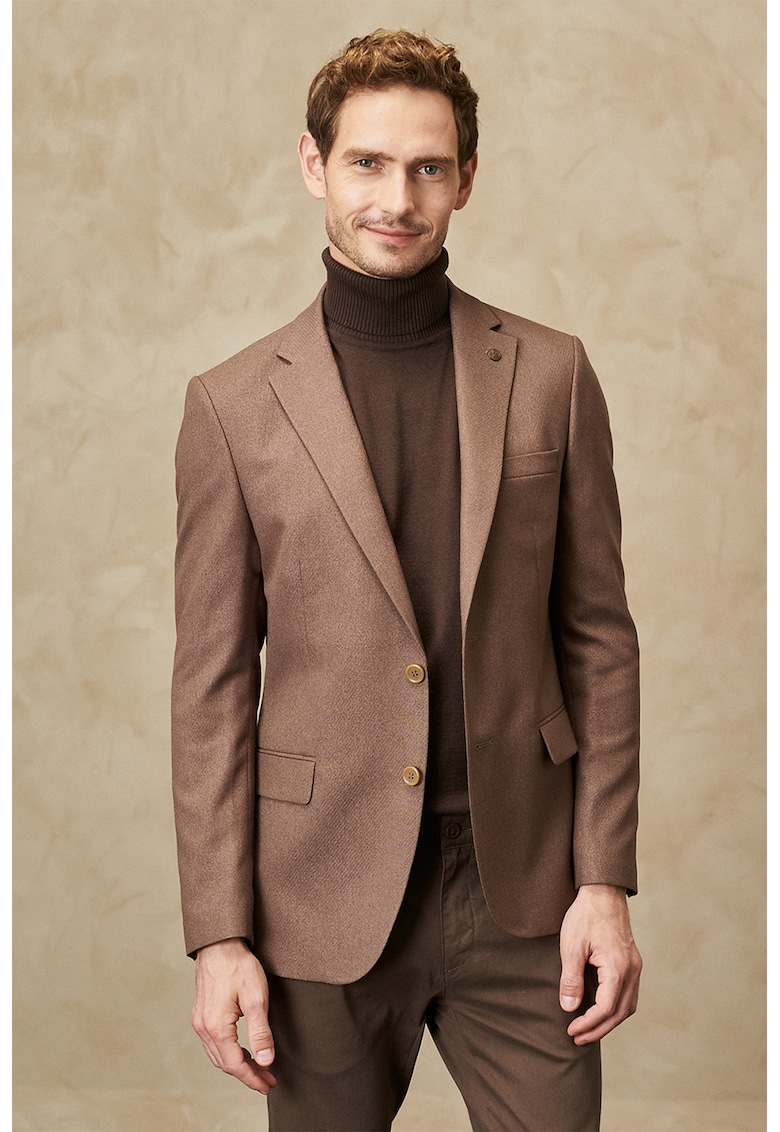 Caracteristici Culoare: maro deschis Imprimeu: uni Material: poliester Stil: elegant Croiala: regular fit Guler: cu revere decupate Lungime maneca: maneca lunga Buzunare: 2 cu clapa