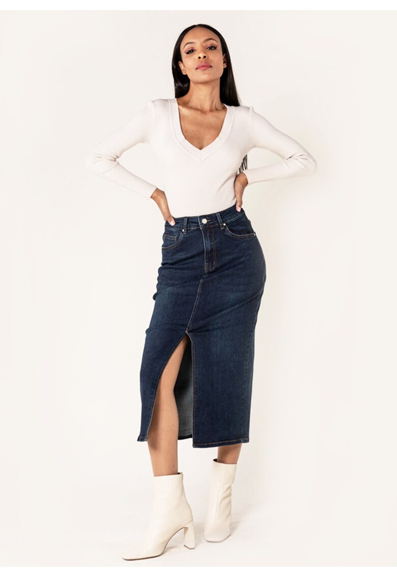 Caracteristici Culoare: albastru inchis Stil: casual Imprimeu: uni Croiala: dreapta Material: denim Talie: inalta Lungime: midi Detalii: slit pe partea din fata Sistem inchidere: fermoar