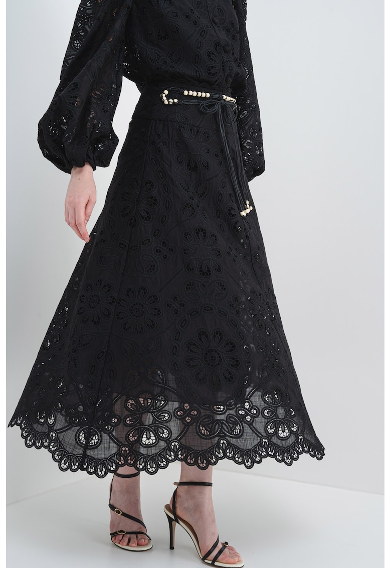 Caracteristici Culoare: negru Stil: casual Imprimeu: floral Croiala: evazat Material: poliester Talie: inalta Lungime: midi Sistem inchidere: fermoar Compozitie Exterior: 100% poliester Info model Modelul poarta un produs de marimea S. Marimi model: 174 cm inaltime