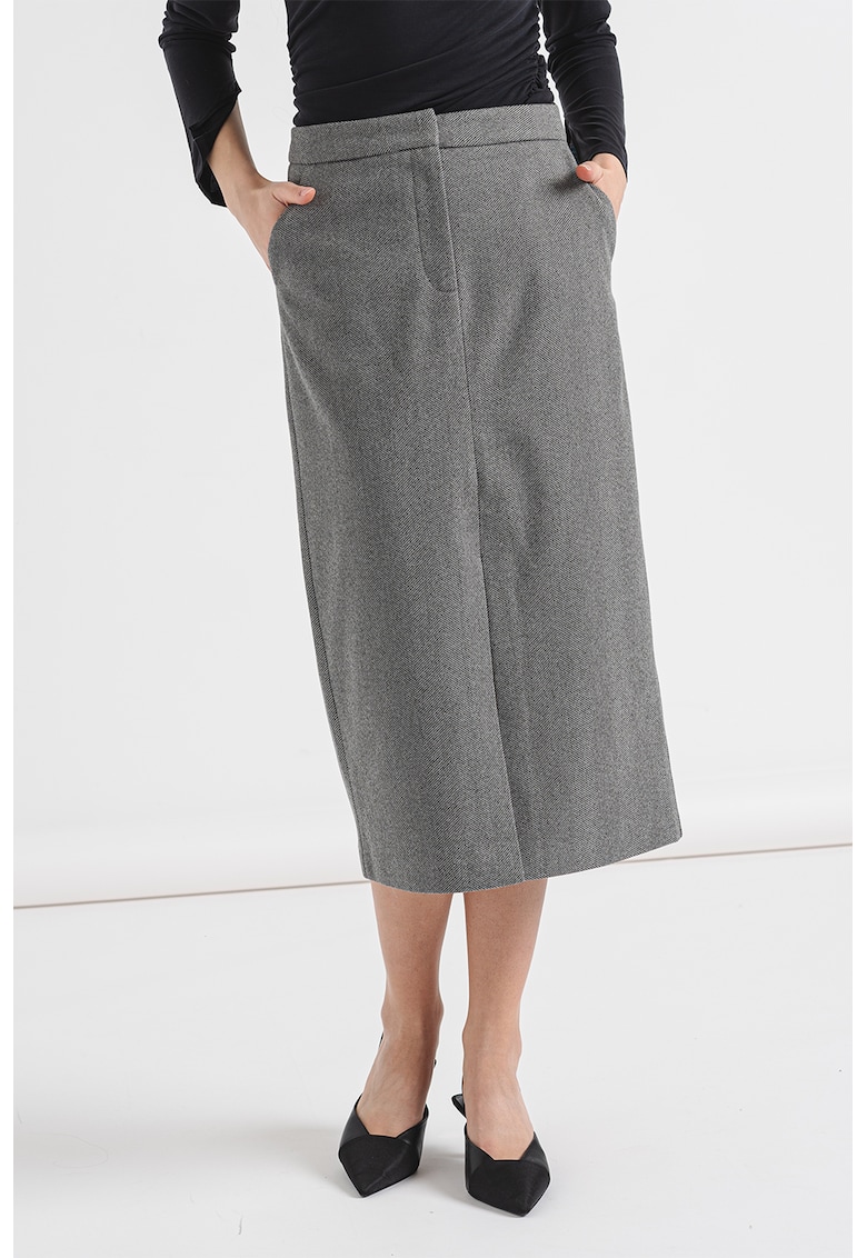 Caracteristici Culoare: gri melange Stil: elegant Imprimeu: herringbone Croiala: creion Material: poliester Talie: inalta Lungime: midi Buzunare: 2 oblice Sistem inchidere: fermoar Compozitie Exterior: 50% poliester