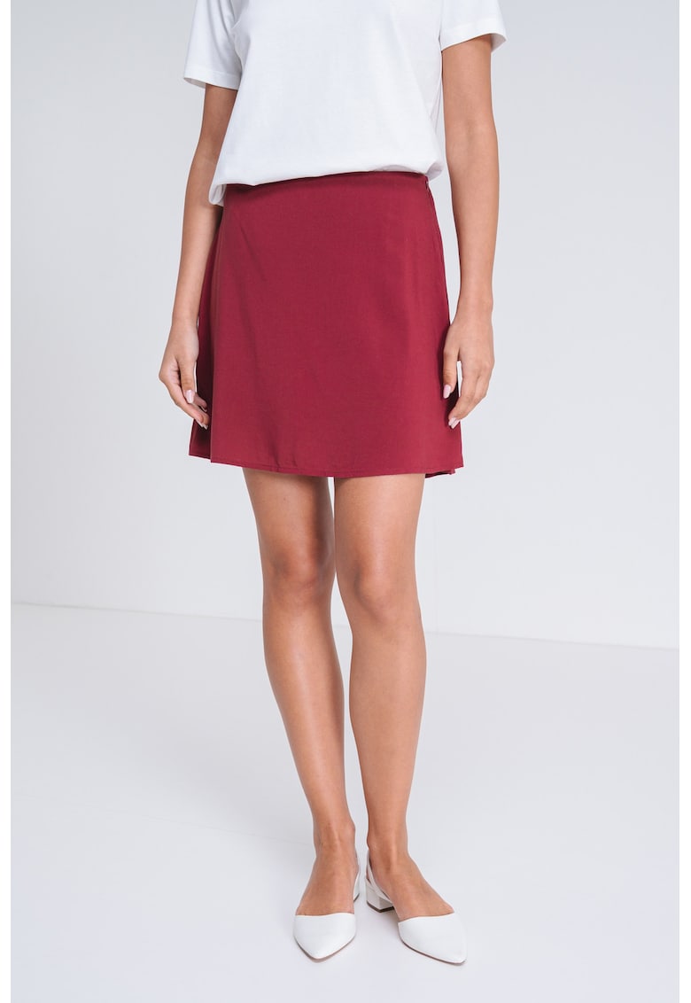 Caracteristici Culoare: visiniu Stil: casual Material: viscoza Imprimeu: uni Croiala: evazat Lungime: scurta Talie: inalta Detalii: cu pantaloni scurti dedesubt Sistem inchidere: fara inchidere Compozitie Exterior: 100% viscoza Info model Modelul poarta un produs de marimea S. Marimi model: 174 cm inaltime