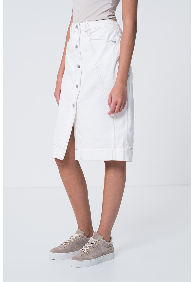 Caracteristici Culoare: alb fildes Stil: casual Imprimeu: uni Croiala: creion Material: denim Talie: medie Lungime: scurta Buzunare: 2 pe partea din spate Detalii: cusaturi contrastante Sistem inchidere: nasturi Compozitie Exterior: 100% bumbac Info model Modelul poarta un produs de marimea L/40 EU. Marimi model: 177 cm inaltime