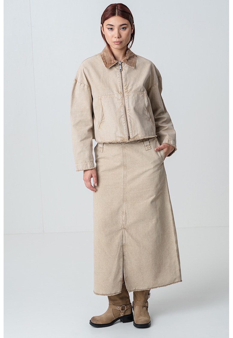 Caracteristici Culoare: verde sparanghel Stil: casual Imprimeu: uni Croiala: in a Material: denim Talie: inalta Lungime: lunga Sistem inchidere: fermoar Compozitie Exterior: 100% bumbac Info model Modelul poarta un produs de marimea S/38 IT. Marimi model: 173 cm inaltime