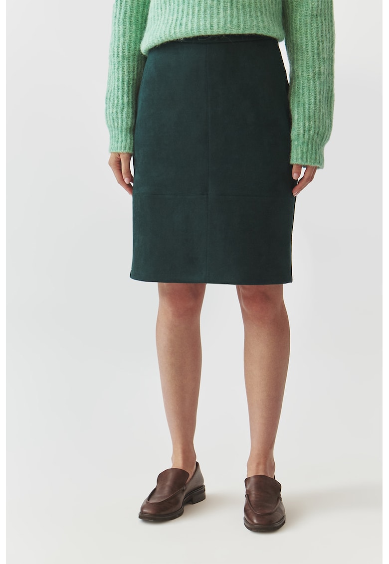 Caracteristici Culoare: verde inchis Stil: elegant Imprimeu: uni Croiala: creion Material: sintetic Talie: inalta Lungime: midi Detalii: slit pe partea din spate