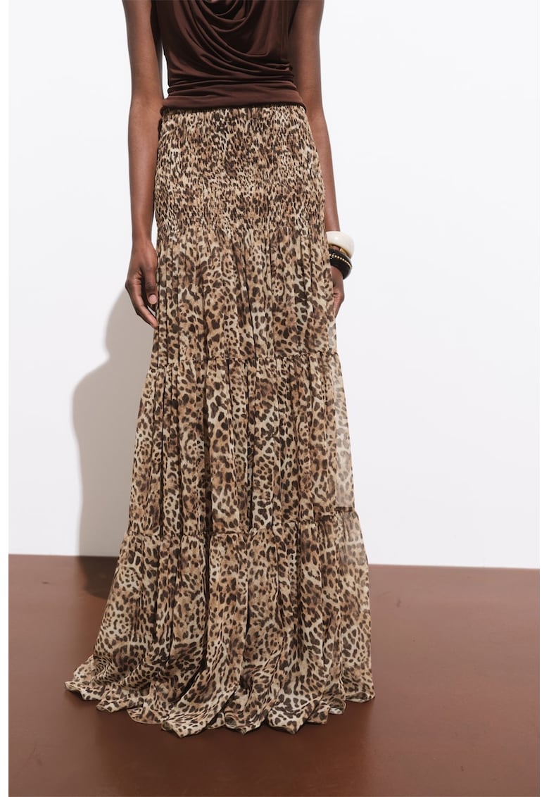 - maro deschis Stil: casual Imprimeu: animal print Croiala: evazat Material: sintetic Talie: medie Lungime: lunga Detalii: talie elastica