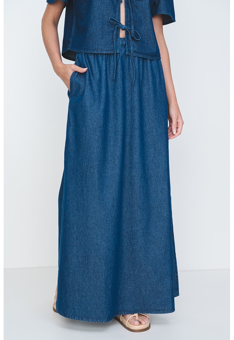 Caracteristici Culoare: albastru inchis melange Stil: casual Imprimeu: uni Croiala: dreapta Material: denim Talie: inalta Lungime: lunga Detalii: talie elastica
