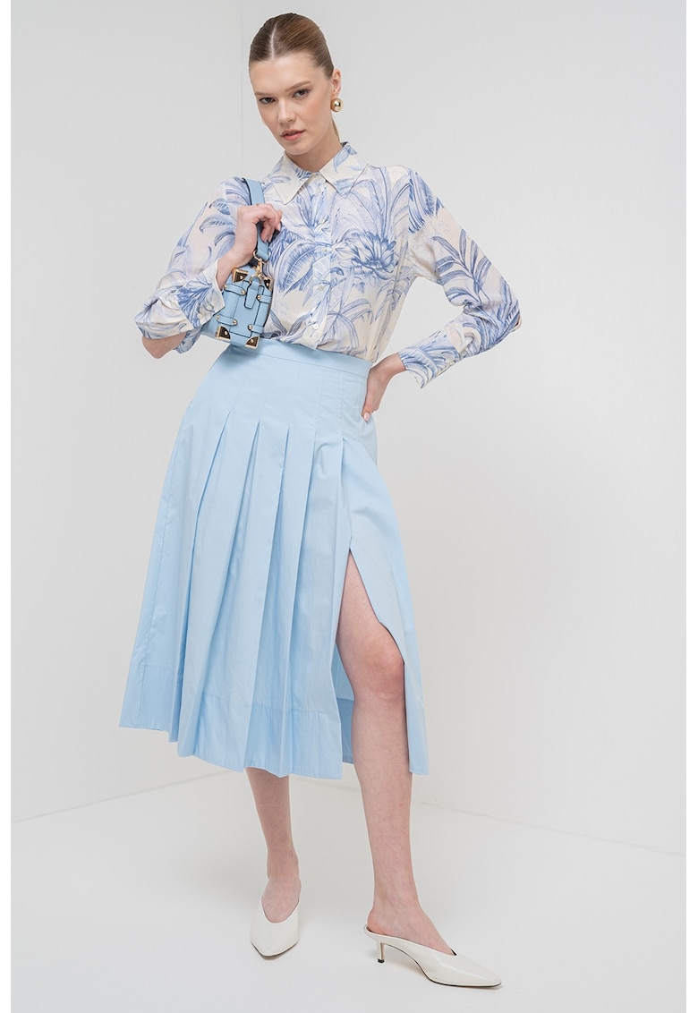 Caracteristici Culoare: albastru deschis Stil: elegant Imprimeu: uni Croiala: evazat Material: bumbac