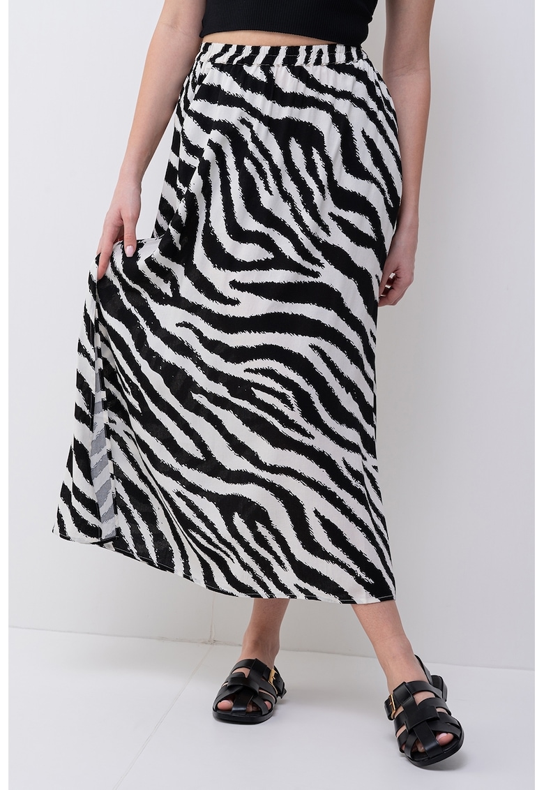 - negru Stil: casual Imprimeu: animal print Croiala: dreapta Material: viscoza Talie: medie Lungime: midi Detalii: slit lateral Compozitie Exterior: 100% viscoza livaeco by birla cellulose™ Info model Modelul poarta un produs de marimea S. Marimi model: 174 cm inaltime