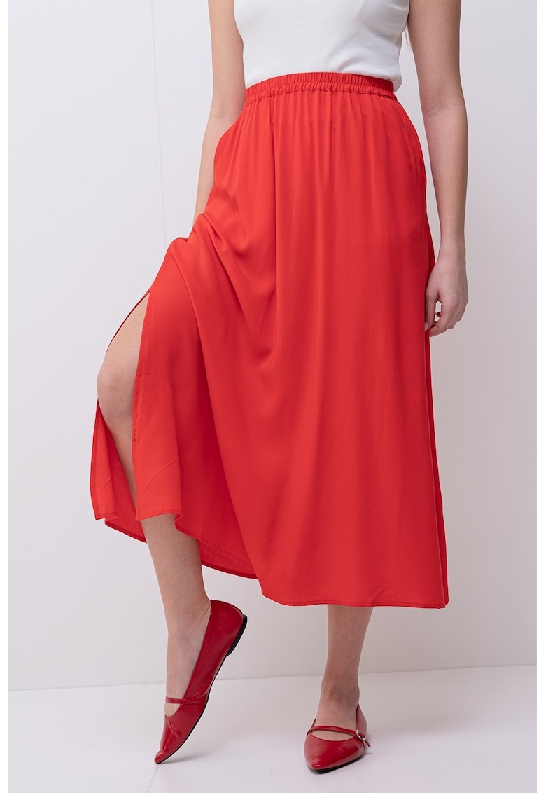 Caracteristici Culoare: rosu vermillion Stil: casual Imprimeu: uni Croiala: dreapta Material: viscoza Talie: medie Lungime: midi Detalii: slit lateral Compozitie Exterior: 100% viscoza livaeco by birla cellulose™ Info model Modelul poarta un produs de marimea S. Marimi model: 174 cm inaltime