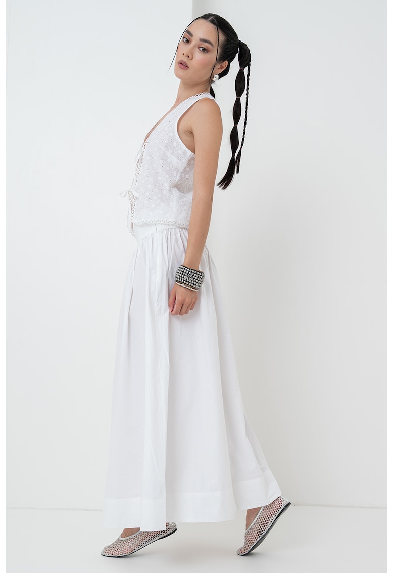 Caracteristici Culoare: alb Stil: casual Imprimeu: uni Croiala: in a Material: bumbac Talie: inalta Lungime: midi Compozitie Exterior: 100% bumbac Info model Modelul poarta un produs de marimea S. Marimi model: 170 cm inaltime