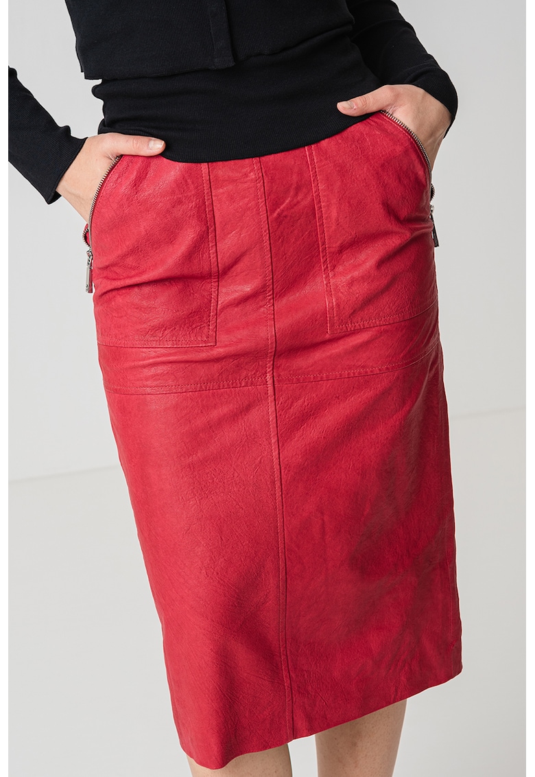 Caracteristici Culoare: visiniu Stil: casual Imprimeu: uni Croiala: creion Material: piele naturala Talie: medie Lungime: midi Sistem inchidere: fermoar Compozitie Exterior: 100% piele de ovina Captuseala: 100% poliester Info model Modelul poarta un produs de marimea S/38 IT. Marimi model: 173 cm inaltime