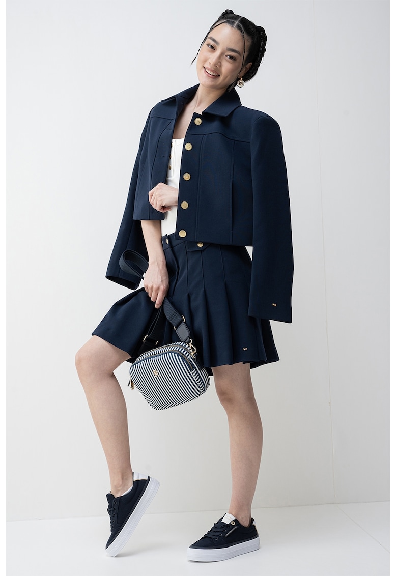 Caracteristici Culoare: bleumarin Stil: casual Imprimeu: uni Croiala: evazat Material: sintetic Talie: inalta Lungime: scurta Detalii: design plisat Sistem inchidere: fermoar Compozitie Exterior: 60% poliester reciclat