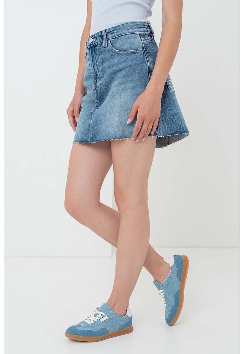 Caracteristici Culoare: albastru melange Stil: casual Imprimeu: uni Croiala: in a Material: bumbac Talie: inalta Lungime: scurta Buzunare: 5 buzunare Sistem inchidere: fermoar Compozitie Exterior: 100% bumbac Info model Modelul poarta un produs de marimea 36. Marimi model: 170 cm inaltime