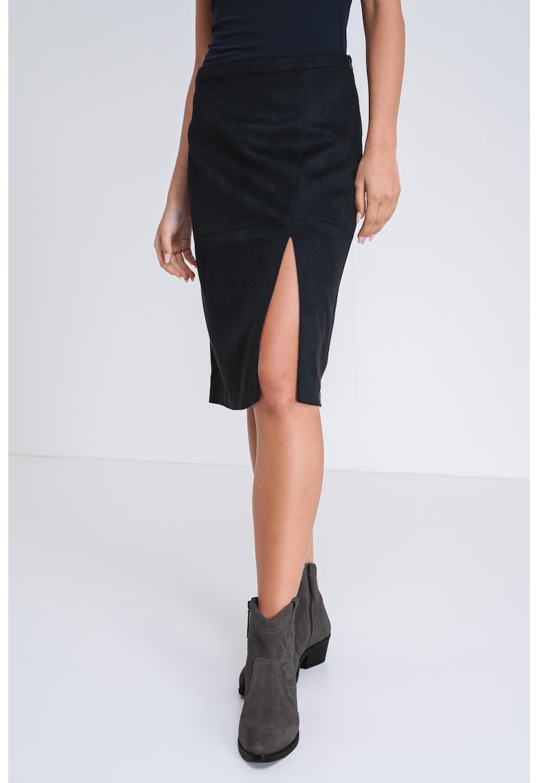 Caracteristici Culoare: negru Stil: casual Imprimeu: uni Croiala: dreapta Material: poliester Talie: medie Lungime: scurta Detalii: slit pe partea din fata Sistem inchidere: fermoar Compozitie Exterior: 100% poliester Info model Modelul poarta un produs de marimea S. Marimi model: 174 cm inaltime