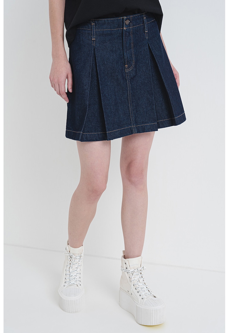 Caracteristici Culoare: albastru inchis Stil: casual Imprimeu: uni Croiala: evazat Material: denim Talie: medie Lungime: scurta Compozitie Exterior: 100% bumbac Info model Modelul poarta un produs de marimea 27. Marimi model: 177 cm inaltime