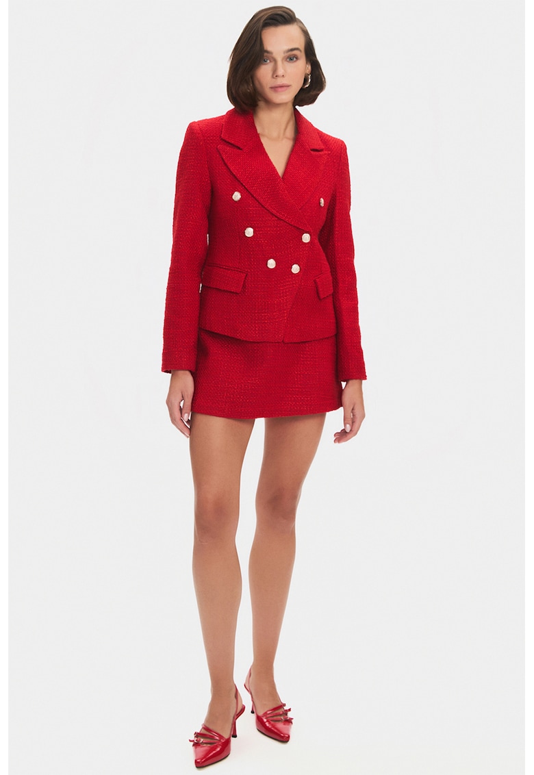 Caracteristici Continut pachet: sacou si fusta Culoare: rosu Imprimeu: uni Material: sintetic