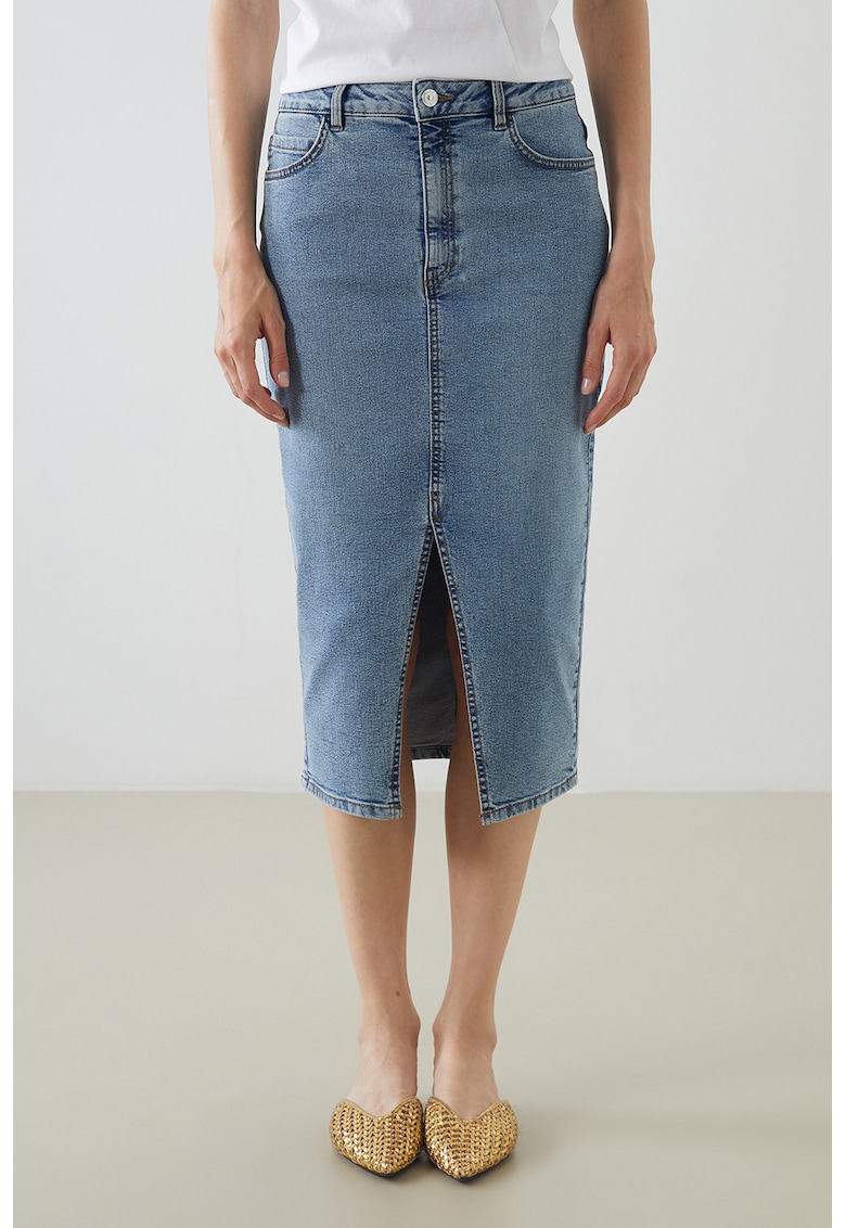 Caracteristici Culoare: albastru deschis Stil: casual Imprimeu: uni Croiala: creion Material: denim Talie: medie Lungime: midi Buzunare: 5 Detalii: slit pe partea din fata