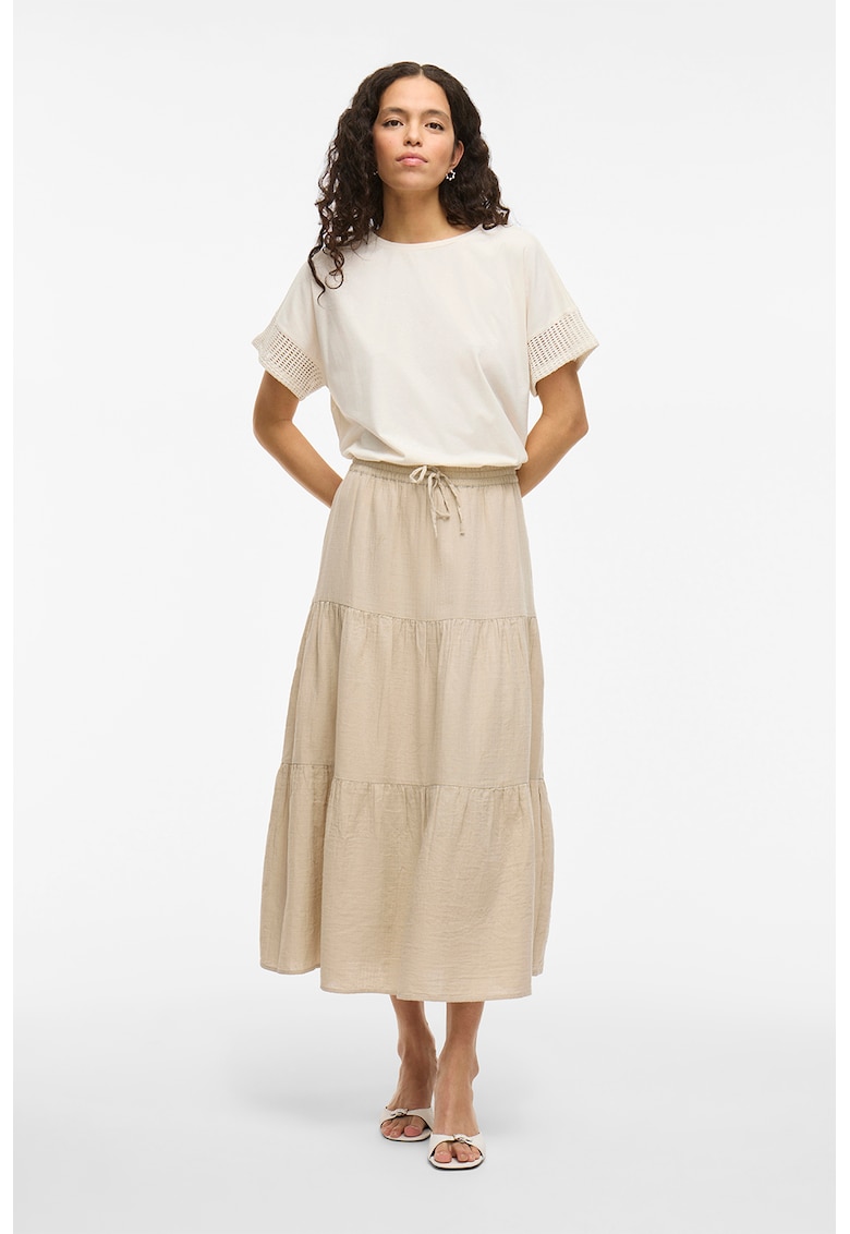 Caracteristici Culoare: bej deschis Stil: casual Imprimeu: uni Croiala: evazat Material: bumbac organic Talie: medie Lungime: lunga Detalii: snur pentru ajustare si insertie elastica in talie