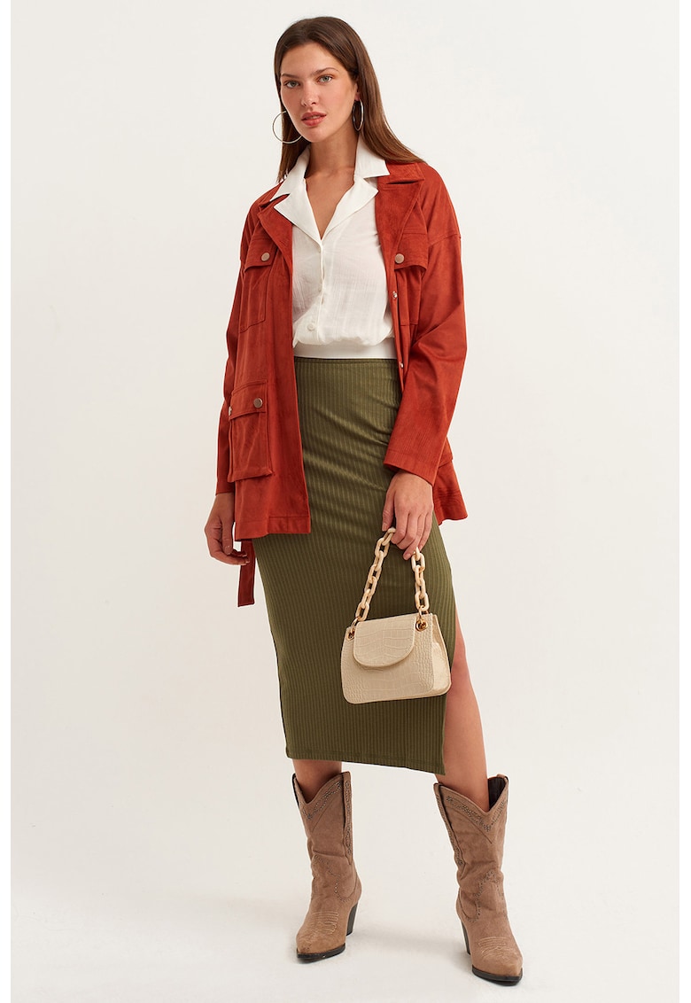 - viscoza Talie: inalta Lungime: midi Detalii: slit lateral Sistem inchidere: fara inchidere Compozitie Exterior: 62% poliester