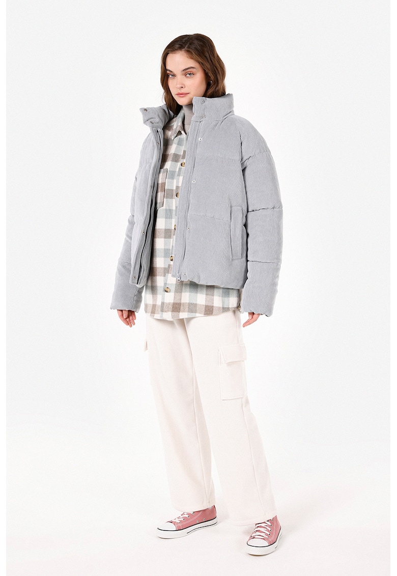 Caracteristici Tip produs: geaca Culoare: gri deschis Imprimeu: uni Material: sintetic Croiala: regular fit Guler: mediu Gluga: fara gluga Lungime maneca: maneca lunga Buzunare: laterale Sistem inchidere: fermoar