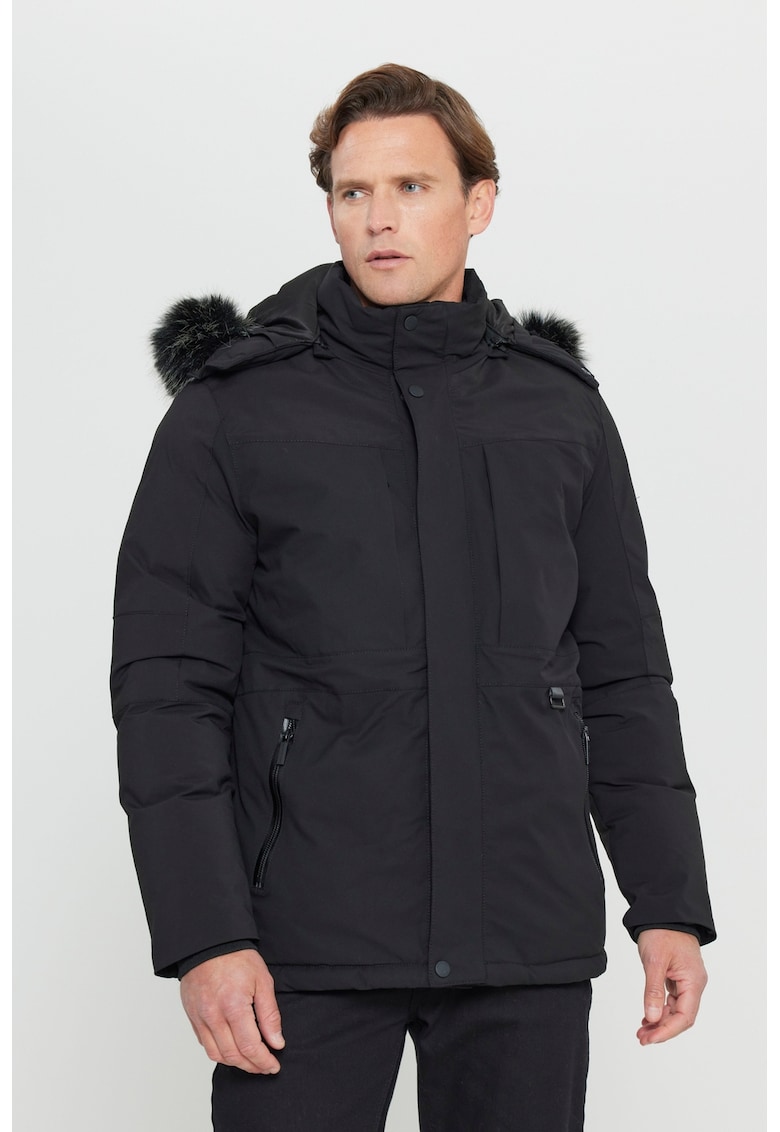 Caracteristici Tip produs: geaca Culoare: negru Material: poliester Imprimeu: uni Gluga: cu gluga Guler: cu blana sintetica detasabila Lungime maneca: maneca lunga Detalii: bareta pentru umar Sistem inchidere: fermoar Compozitie Exterior: 100% poliester