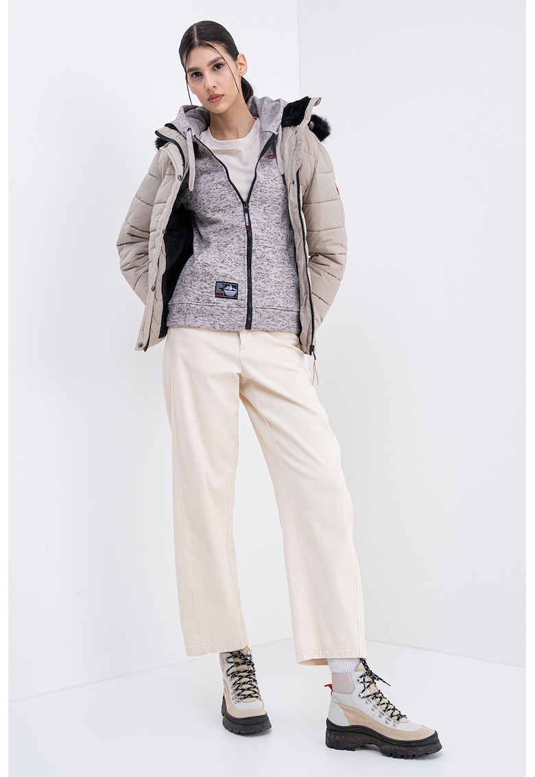 Caracteristici Tip produs: geaca Culoare: bej deschis Imprimeu: uni Material: sintetic Croiala: regular fit Gluga: cu gluga Lungime maneca: maneca lunga Buzunare: 2 cu fermoar Detalii: realizate din material reciclabile Sistem inchidere: fermoar Compozitie Exterior: 100% poliester Info model Modelul poarta un produs de marimea S. Marimi model: 181 cm inaltime